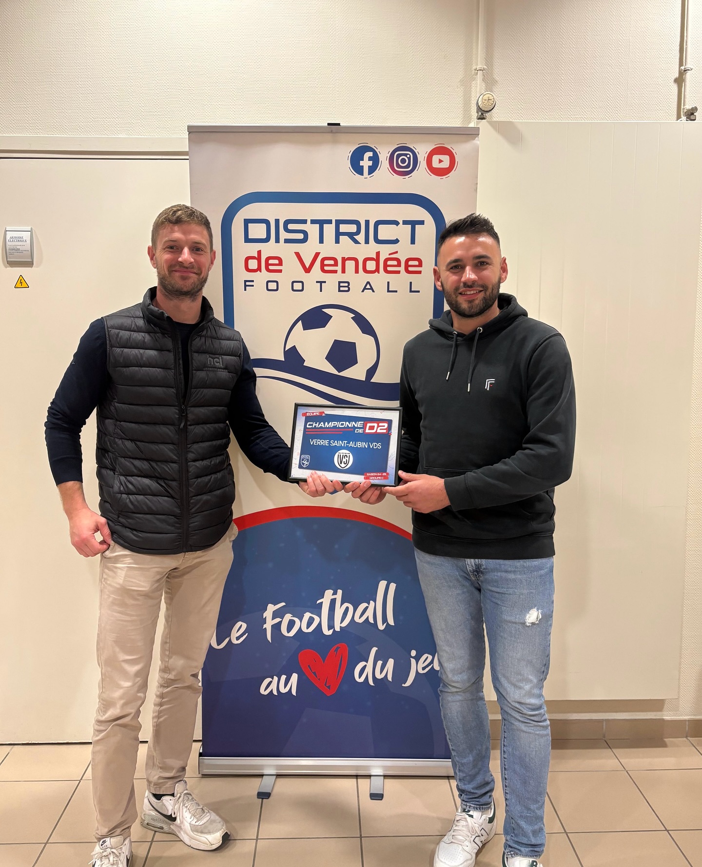 Hier soir, lors de l’Assemblée Générale du District de Vendée de Football, nos deux co-présidents Johann et Quentin, ont eu le plaisir de récupérer le cadre « Équipe championne de D2 »