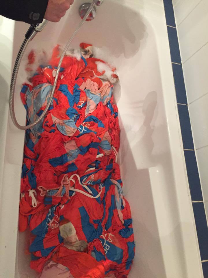 C’est l’angoisse de tous les joueurs à la fin d’un match. Qui va être de maillot ? Et cette fois-ci, c’est Alexis qui s’y colle ! Pas de peau pour lui, les gris évoluaient en Orange ce week-end, c’est donc Maillots – Shorts – Chaussettes qui ont du passer à la machine… Du moins à la baignoire dans un premier temps ! Sous les conseils avisés de sa mère, « il vaut mieux les faire tremper dans l’eau un peu avant sinon ils ne vont pas revenir parfaitement ». Si tu le dis…